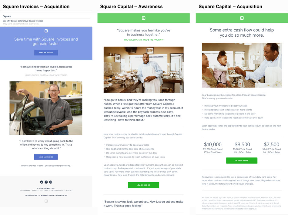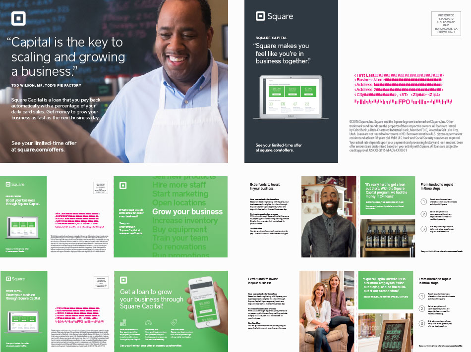| Direct Mail Direct mail had been one of our most successful channels as Square focused on urban and suburban neighborhoods with many up and coming new businesses so we made sure to capture assets that could be used here too. |