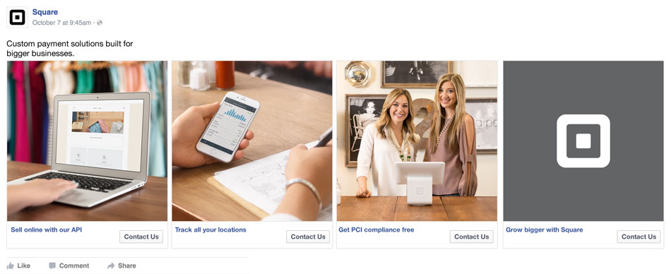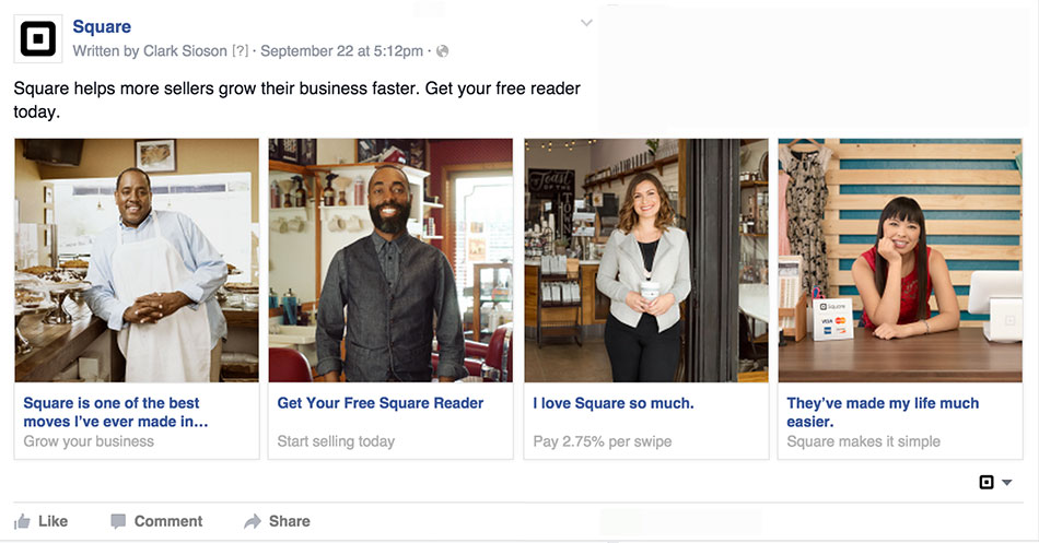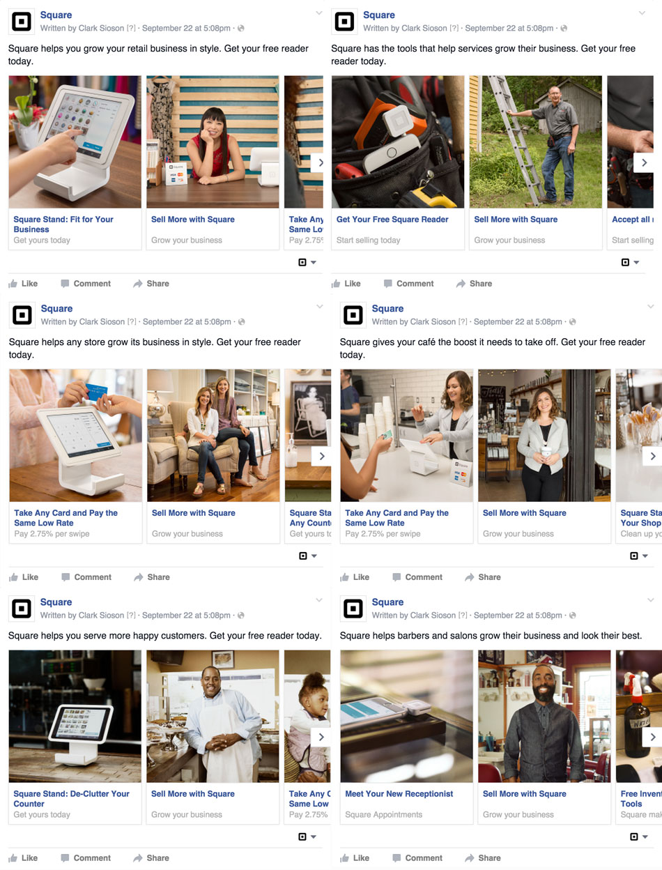 | Social Facebook was our main social channel for this campaign and we ran static, carousel, and video ads. In all, we produced over 20 different videos promoting different sellers and different Square products. |