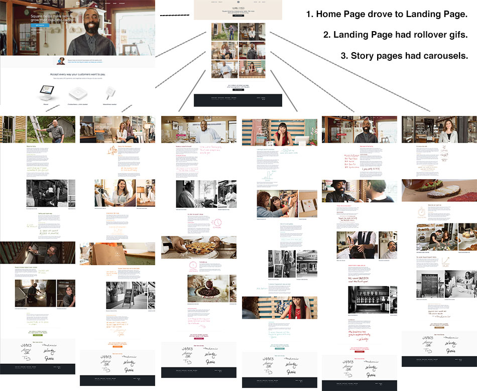 | Marketing Website Broadcast TV drove to Square.com, while other channels drove to the campaign landing page that linked out to the individual sellers' pages. This was the first time the Square website had any rollover gifs or image carousels. We had to bribe the web developer to get this custom work done! Click any of the preview images to read the stories. |