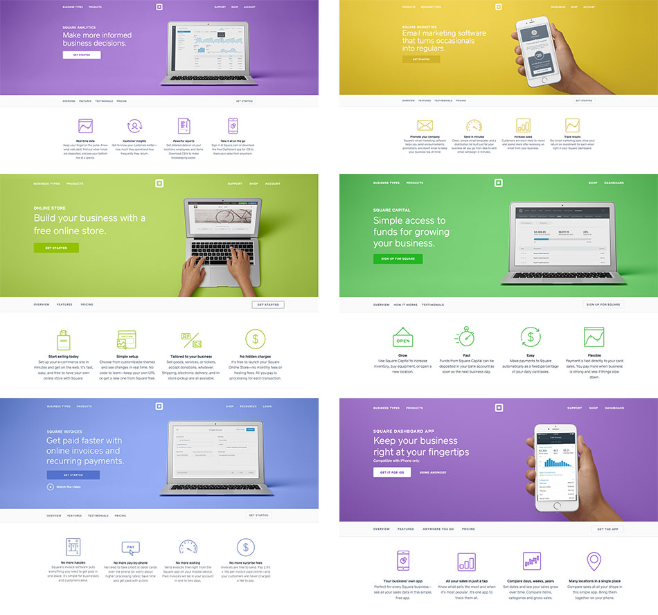 | Marketing Website We carried the look and feel of the campaign over to our home page, and then applied the same art direction to each of our product pages. Products were assigned a color which was applied to the hero image and the iconography on the page. Click any header to see a higher resolution view of that page. It's likely that I wrote each one, though I'm not entirely sure anymore. |