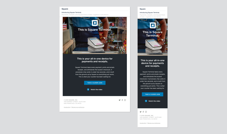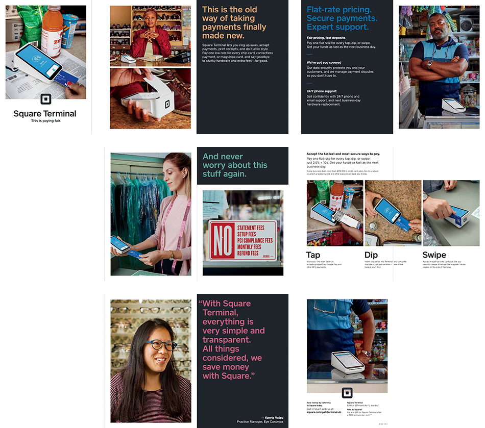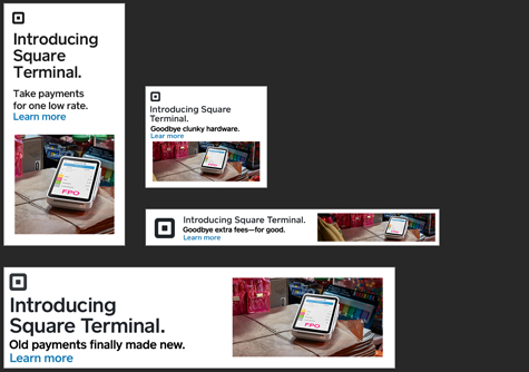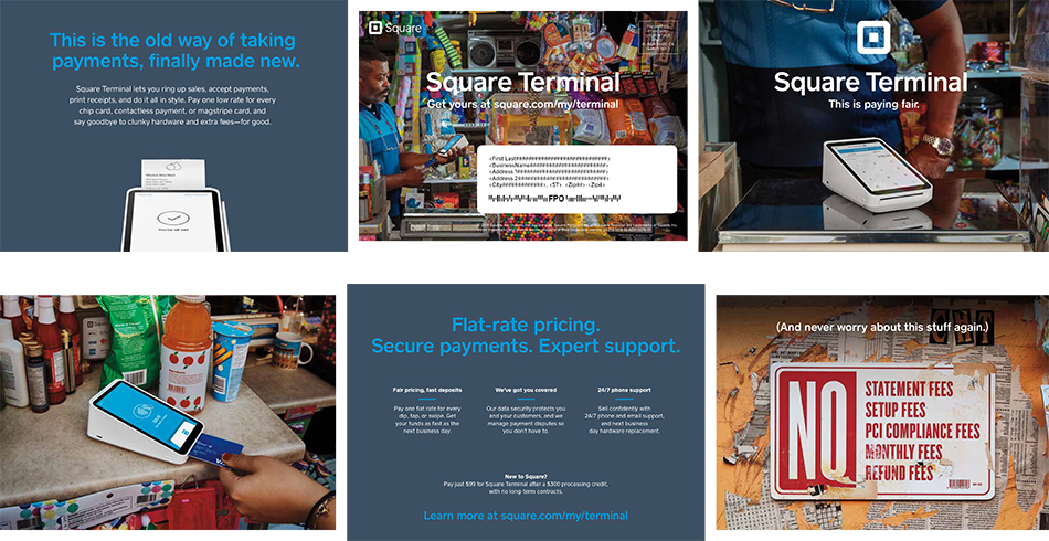 Square Terminal was the first piece of Square hardware launched consecutively in multiple global regions (US, CA-ENG, CA-FR, UK, AU). We created videos, banners, social ads, DM, tutorials, and an email outreach campaign that all drove to our product landing page. We also developed sales materials to support enterprise-level customers. This was my first campaign as CD and I had to build a second creative team for the tutorial pieces because it was too much for any one team to handle in the time we had to go to market. Copywriter: Kae Yen Wong, Art Director: Andrea Stadelman, Tutorial Copywriter: Kari Keller. |